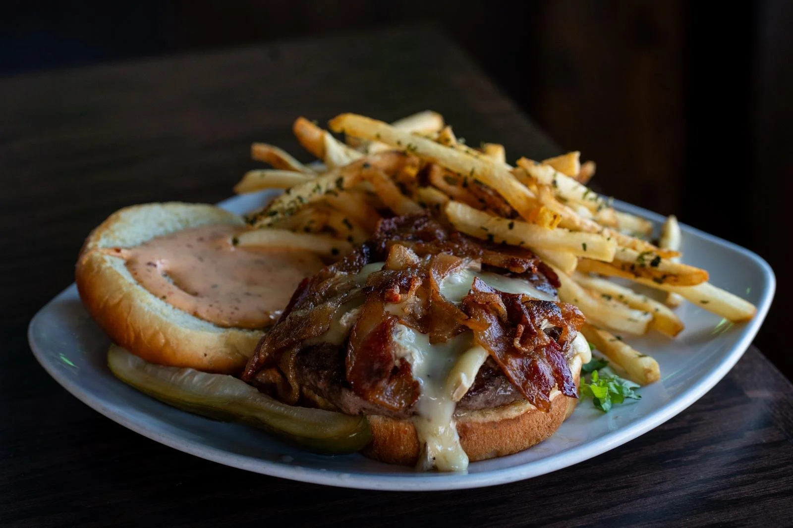 House Ground Beef, White Cheddar, Applewood Smoked Bacon, Crispy Onions, BBQ