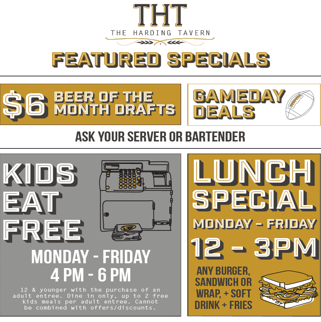 Specials & Events We host events every month with a different brewing company or liquor brand. See what’s next at The Harding Tavern. We’re social!